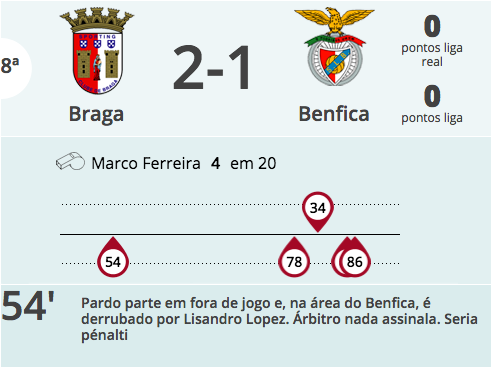 No Braga vs Benfica da 8ª jornada diz que ficaram 2 pénalties por marcar a favor do Benfica e 2 contra. O que é engraçado e que assenta que nem uma luva à verdade desportiva de Rui Santos é a análise ao lance de pénalti contra o Benfica que é apresentado na imagem. Pardo parte em fora-de-jogo, é derrubado na área e devia ser marcado... pénalti contra o Benfica. Pensei que ele fosse dizer que o árbitro deveria ter assinalado fora-de-jogo mas isso não tinha nada a ver com a forma de analisar os lances de Rui Santos. De qualquer maneira ao admitir que existiu fora-de-jogo nesse lance existem 2 penalties por marcar a favor do Benfica e 1 contra. Logo deveria ser adicionado mais um ponto ao Benfica se ele contasse lances de grande penalidade (isto pela análise dele ao jogo, porque ainda existiu um penalti por marcar numa mão dentro de área a remate de Sálvio).